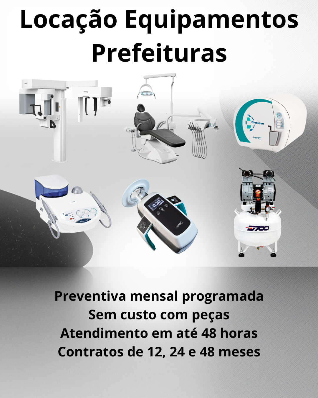 Locação de equipamentos odontológicos e de esterilização: disponibilizamos autoclaves, compressores, cadeiras odontológicas, aparelhos de raios X e outros equipamentos em regime de locação, com instalação, manutenção preventiva e corretiva inclusas. Ideal para Prefeituras quem deseja estruturar ou ampliar o serviço odontológico sem investimento inicial e reduzido, custos previsíveis e suporte técnico especializado. Equipamentos atualizados, em conformidade com normas da Vigilância Sanitária, garantindo segurança, desempenho e continuidade do atendimento.